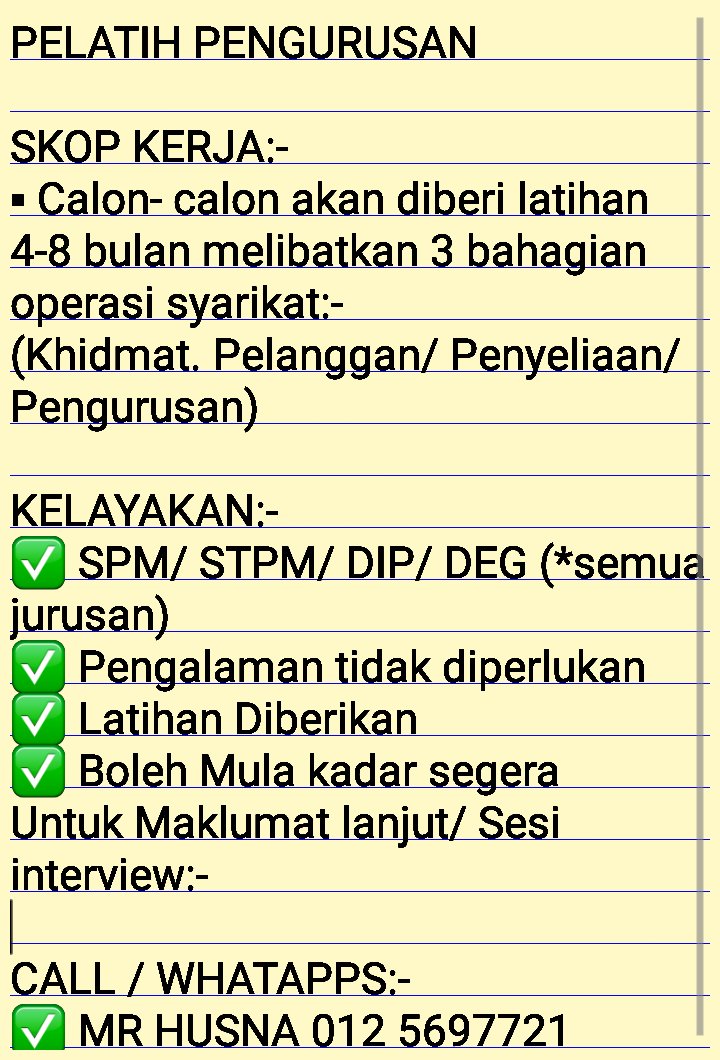 Jawatan kosong 2019 terkini ok? Jawatan kosong terkini kerajaan 2021 (kementerian kesihatan malaysia) kelayakan pt3 / pmr pembantu perawatan kesihatan, gred u11 tarikh. Jawatan kosong terkini di kumpulan wang simpanan pekerja (kwsp) september 2018. Jawatan kosong ini telah dibuka kepada selu. Untuk makluman, terdapat beberapa kekosongan jawatan yang dibuka untuk permohonan oleh pihak perbadanan produktiviti malaysia (mpc).