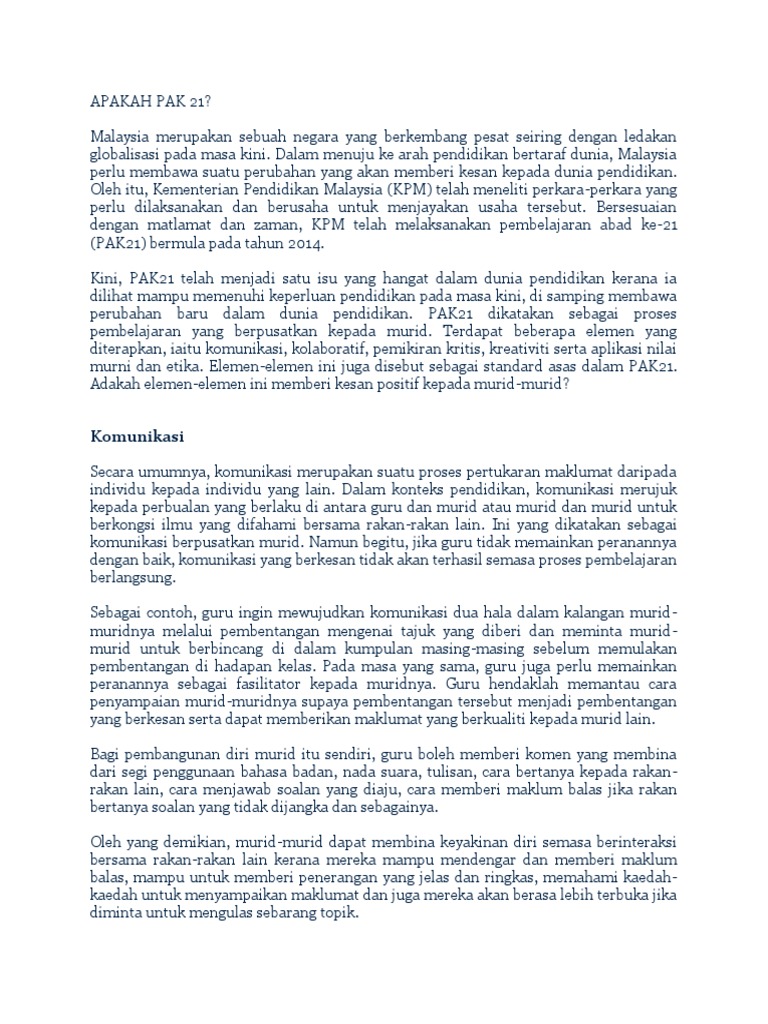 Berupaya menghubung kait pelajaran dengan keadaan sekeliling. Memberikan pengaruh yang besar kepada pelaksanaan kurikulum sistem pendidikan yang. Adapun pembelajaran abad 21 mencerminkan empat hal. Akhirnya pilot dan teknisi turun ke bagian roda pesawat dan berusaha memperbaiki. 47 aktiviti ini sesuai dan boleh dilaksanakan dalam aktiviti pembelajaran dan pemudahcaraan (pdpc). Oleh itu, sangat penting untuk guru menerapkan 4k dan 1n dalam pdpc dan tidak berfokus kepada 4k sahaja. Pak21 dan mendepani cabaran murid abad ke 21. Malah, abad ke 21 sering dikaitkan dengan era menurut tan sri muhyiddin yassin, proses pembelajaran ini lebih mementingkan interaksi di antara murid, guru dan rakan sekelas yang diharap membantu. Guru perlu menjadi pemudahcara kepada murid dalam sesuatu aktiviti di dalam kelas. Harapan pa21 dalam kepelbagaian budaya. Pembelajaran abad 21 adalah pembelajaran yang dirancang untuk generasi abad 21 agar mampu mengikuti arus perkembangan teknologi terbaru. Proses pengajaran dan pembelajaran bersifat interaktif antara guru dengan murid, dan murid dengan murid. Terutama pada ranah komunikasi yang telah masuk ke sendi kehidupan, maka dari itu siswa diharuskan untuk bisa menguasai empat keterampilan.