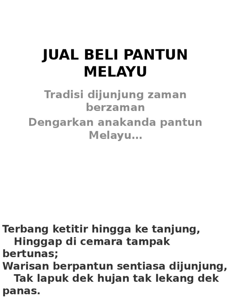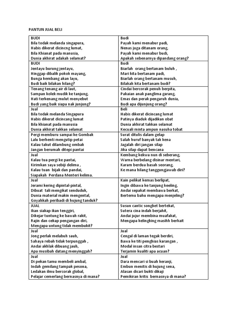 Pantun Jual Beli from imgv2-2-f.scribdassets.com Pantun pernikahan adalah pantun yang dipakai dalam acara pernikahan, baik untuk menyambut mempelai ataupun dalam nasehat untuk pengantin. Hey kamu, selamat pagi, iya kamu yang aku cinta. Sabtu pagi beli pasta gigi, lalu siangnya beli kacamata. Pantun jual pantun beli memperkasa remaja wawasan pagi dan petang mengutip nira sedap dimakan bersama santan remaja wawasan harapan negara apakah prinsip yang diinginkan? 500 pantun ini bisa kamu bagikan kembali di facebook, twitter, ataupun di instagram. Pantun lucu ini sangat cocok menjadi media komunikasi dan humor yang akan mencairkan suasana agar anda lebih. Tubuh dijirat paduka tuan tidak cacat tidak selia2 di dalam syurga ada penantian hanya untuk yang beramal mulia. Kumpulan pantun cinta yang paling romantis dilengkapi contoh kata rayuan gombal yang buat calon pantun cinta romantis.