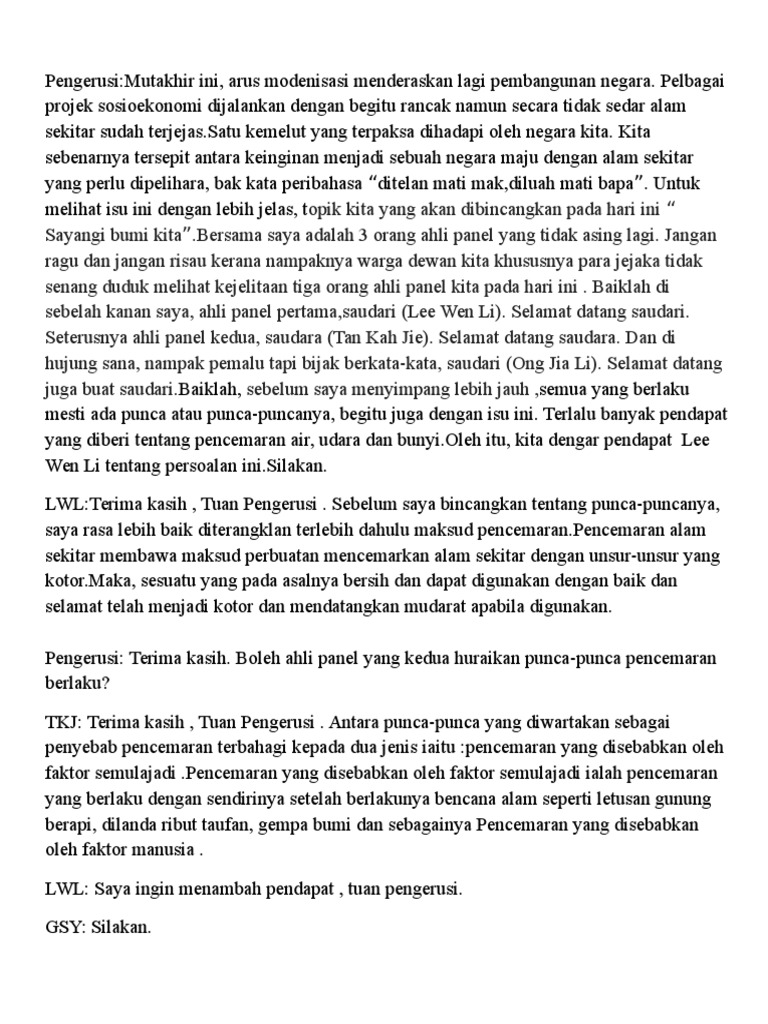 Teks Forum Alam Sekitar : Subjek alam sekitar dalam sukatan pelajaran peringat sekolah rendah dan menengan akan diperkenalkan bermula tahun depan, kata menteri sumber asli dan alam sekitar, datuk seri wan junaidi tuanku jaafar.. Pendahuluan terima kasih kepada saudara pengerusi yang molek pekertinya membawa persoalan. Alam sekitar yang tidak tercemar memberikan kita satu suasana yang selesa dan mennyamankan. Subjek alam sekitar dalam sukatan pelajaran peringat sekolah rendah dan menengan akan diperkenalkan bermula tahun depan, kata menteri sumber asli dan alam sekitar, datuk seri wan junaidi tuanku jaafar. Posted by kelab alam sekitar at 08:31 0 comments. Pemuliharaan alam sekitar di sabah negeri sabah yang terletak di bahagaian utara pulau borneo, merupakan negeri yang kedua terbesar di seluruh malayasia dengan keluasan 73,619 km persegi.
